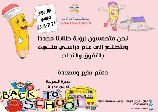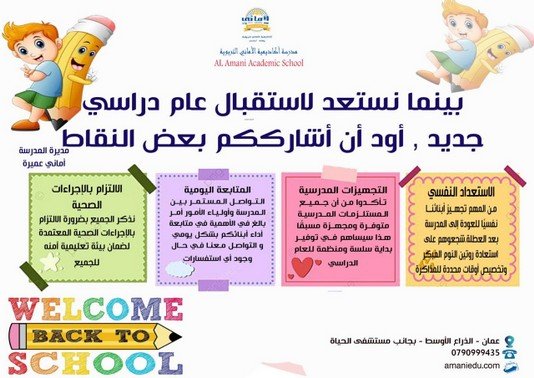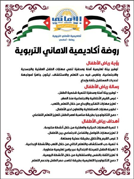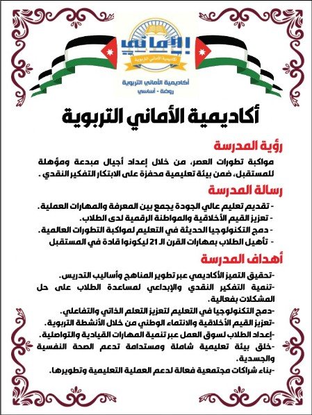 اكاديمية الاماني التربوية / المدارس الخاصة, عمان / بواسطة modernjcfe@gmail.com اكاديمية الاماني التربوية مدرسة ابتدائية Amman, Jordan 07 9099 9435 alamaniacadmic_school@yahoo.com amaniedu.co التعريف بـ المدرسة والروضة مدارسنا عريقة – تأسست 1980 رسالتها العلم – الايمان – العمل المبادىء الاساسية لاختيارك مدرسة لابنائكم (الخبرة والعراقة في العطاء ( ادارة ومعلمات – أربعون عاماً على التأسيس – النجاح المستمر على مدى السنين بفضل الله – النشاطات والوسائل المعينة على التعلم الحديث – الارتياح التام من الخدمات المقدمة كالمواعيد الباصات والجولات – تقوية وتعمق في المناهج المقررة – الصبغة الدينية والاخلاق الحميدة سائدة – نشاطات خارجية وداخلية تنمي الروح الدينية والوطنية – التسلح بالعلم ومواكبة التطور والتفوق والابداع العلمي – 🏫 اكاديمية الاماني 📞 الهاتف: 0790999435 واتساب فيسبوك إنستغرام